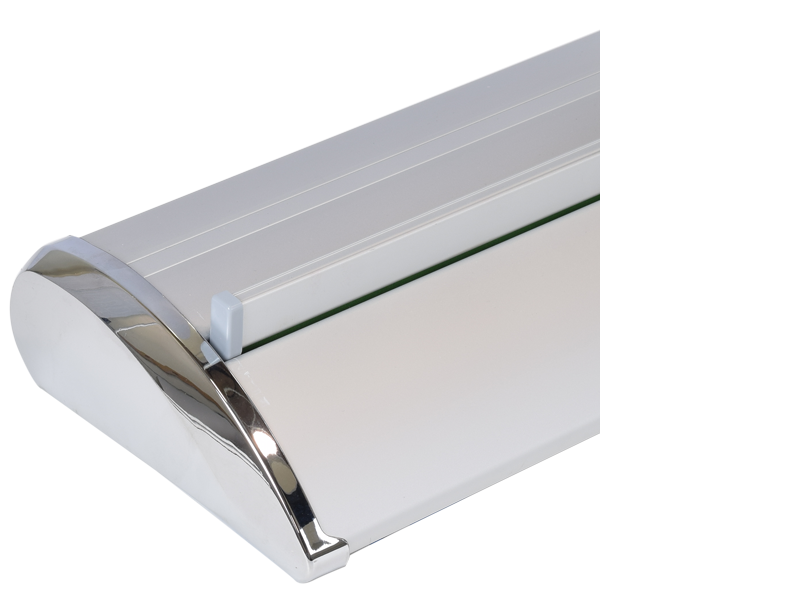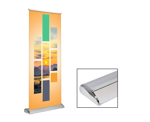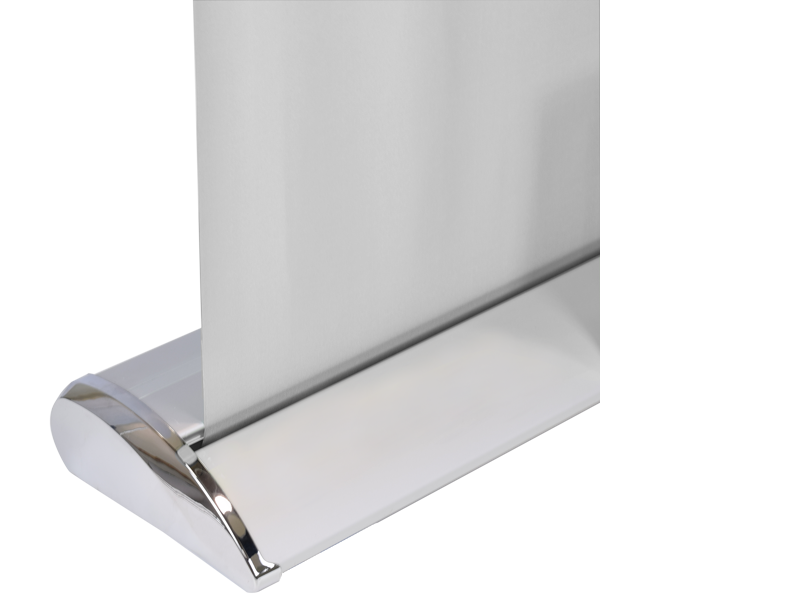 Smooth curl free vinyl print and a sleek and stylish stand at 80" tall. The Deluxe Retractable Stand features a sleek wide base design with polished ends.