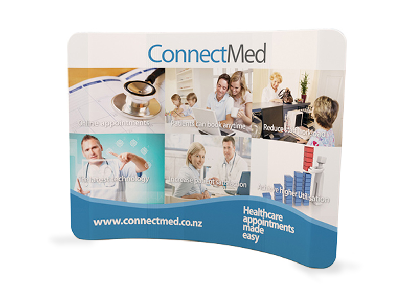Our Tension Displays consist of a lightweight but durable aluminum hardware and a Fabric Dye-Sublimated Print. Very low profile, about 2" deep. The hardware is inserted inside the print, much like a pillow into a pillowcase. The fabric print is stretched tight across the frame and zipped closed. 120”W x 89”H. The curved display has a slight curve inward.